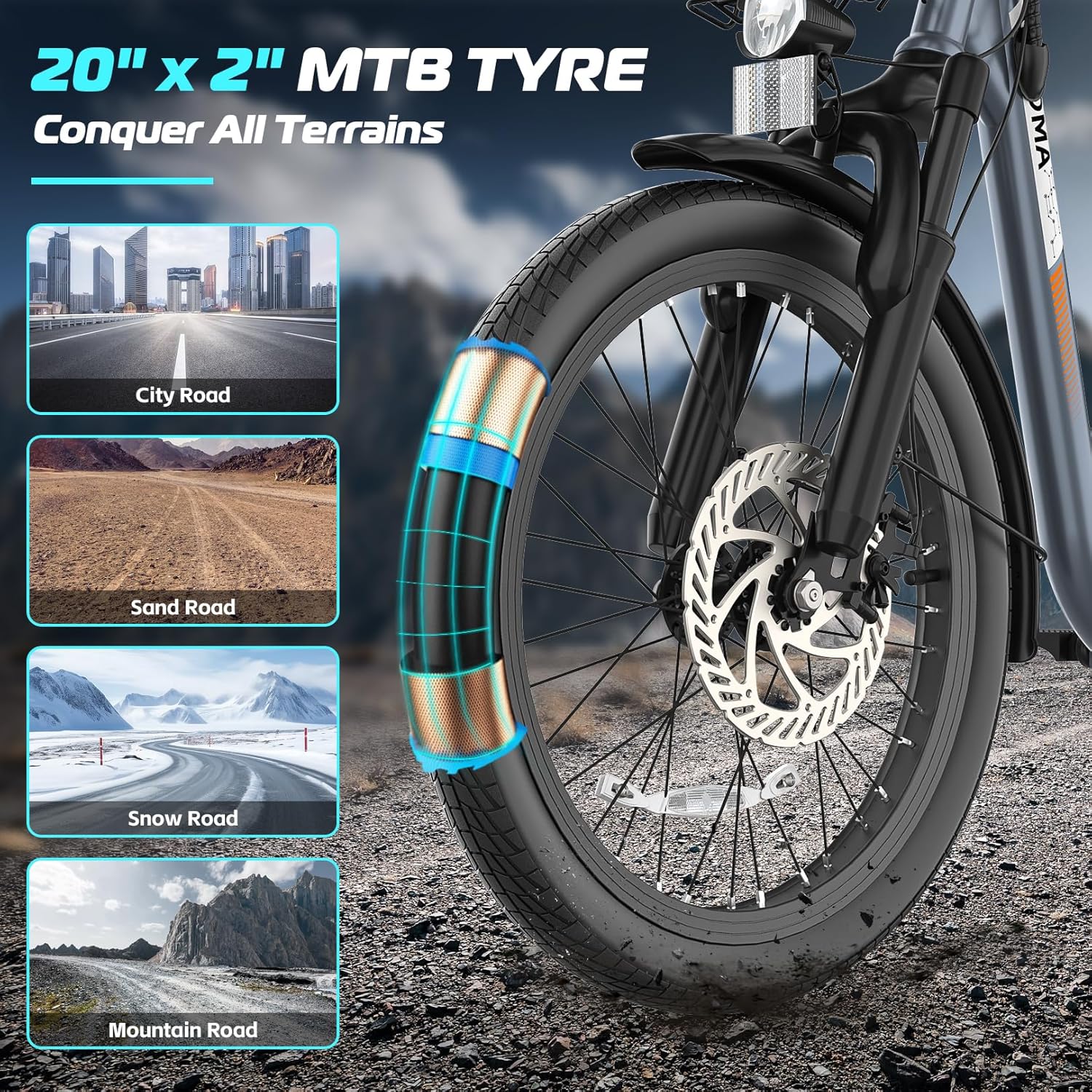 • The Caroma Electric Bike includes a front shock absorber, mechanical dual disc brakes, and protective fenders, ensuring a smooth, safe ride even on rocky terrains.
