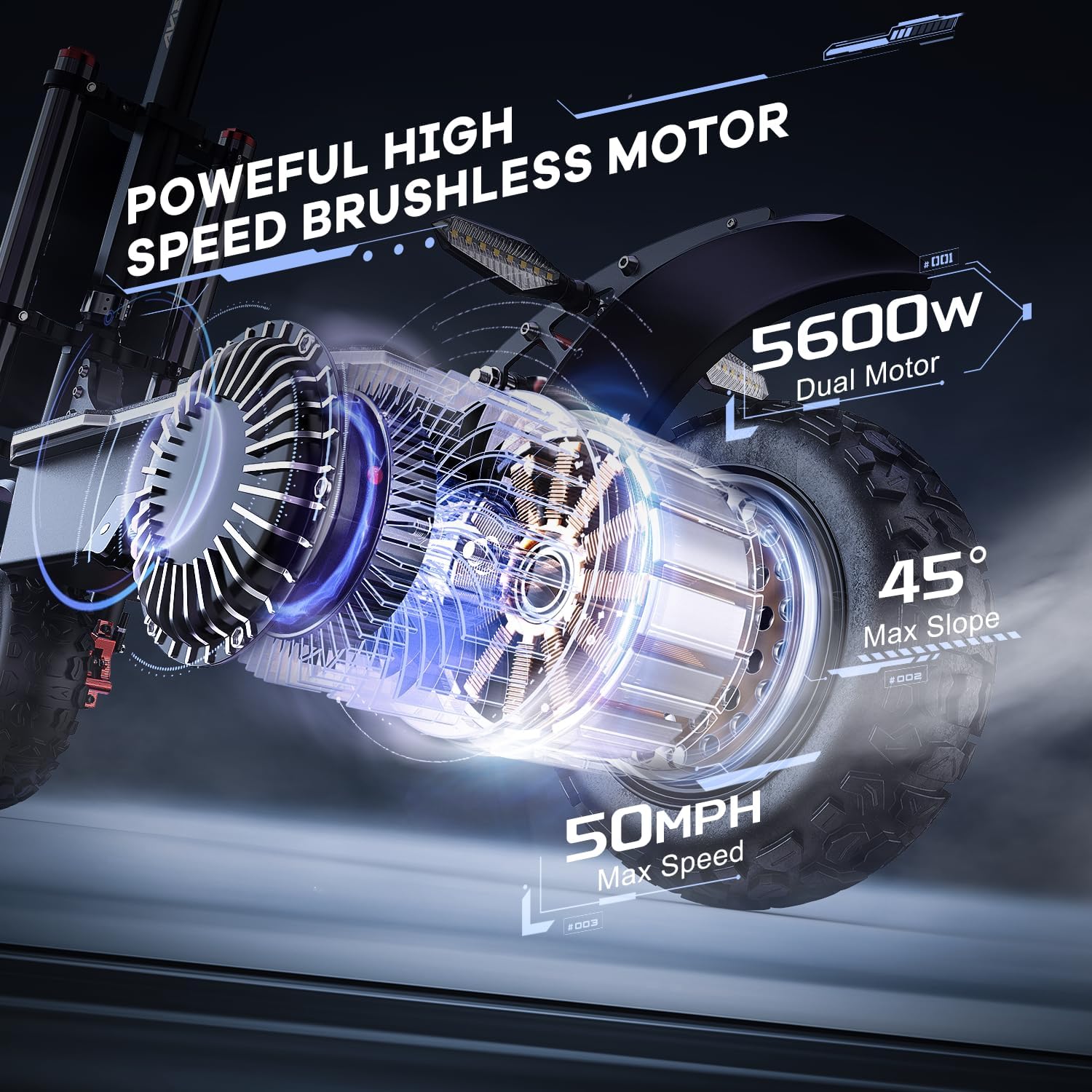 Equipped with dual 2800W brushless motors, this electric scooter delivers a combined power of 5600W. This impressive power allows riders to achieve a top speed of 50 mph, making it one of the fastest scooters available. The ability to tackle 45ยฐ inclines ensures that riders can navigate various terrains without breaking a sweat.