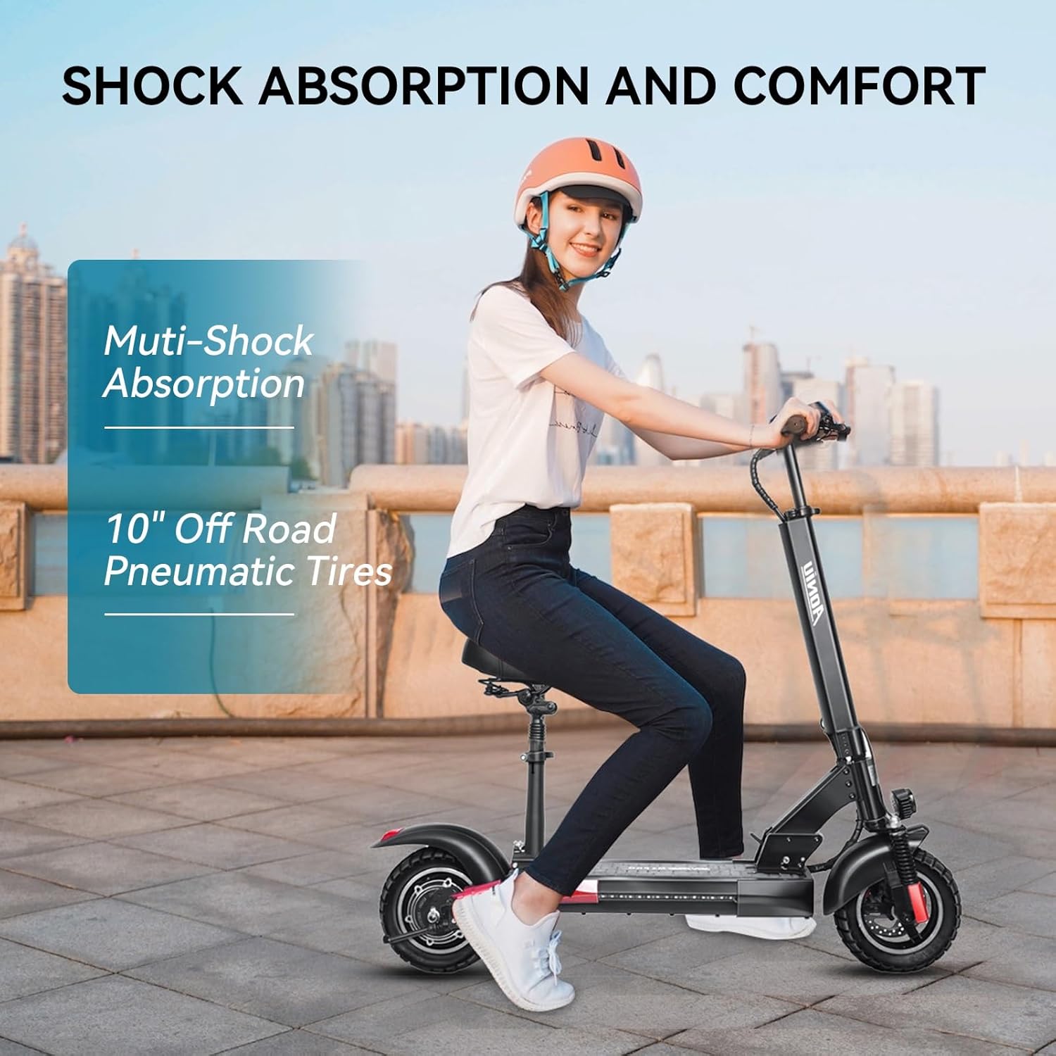 Thanks to its 10-inch pneumatic tires and dual absorbers, the scooter guarantees a comfortable ride across multiple terrains, whether navigating city streets or rugged dirt paths. The shock absorption system provides a stable experience, minimizing bumps and vibrations.