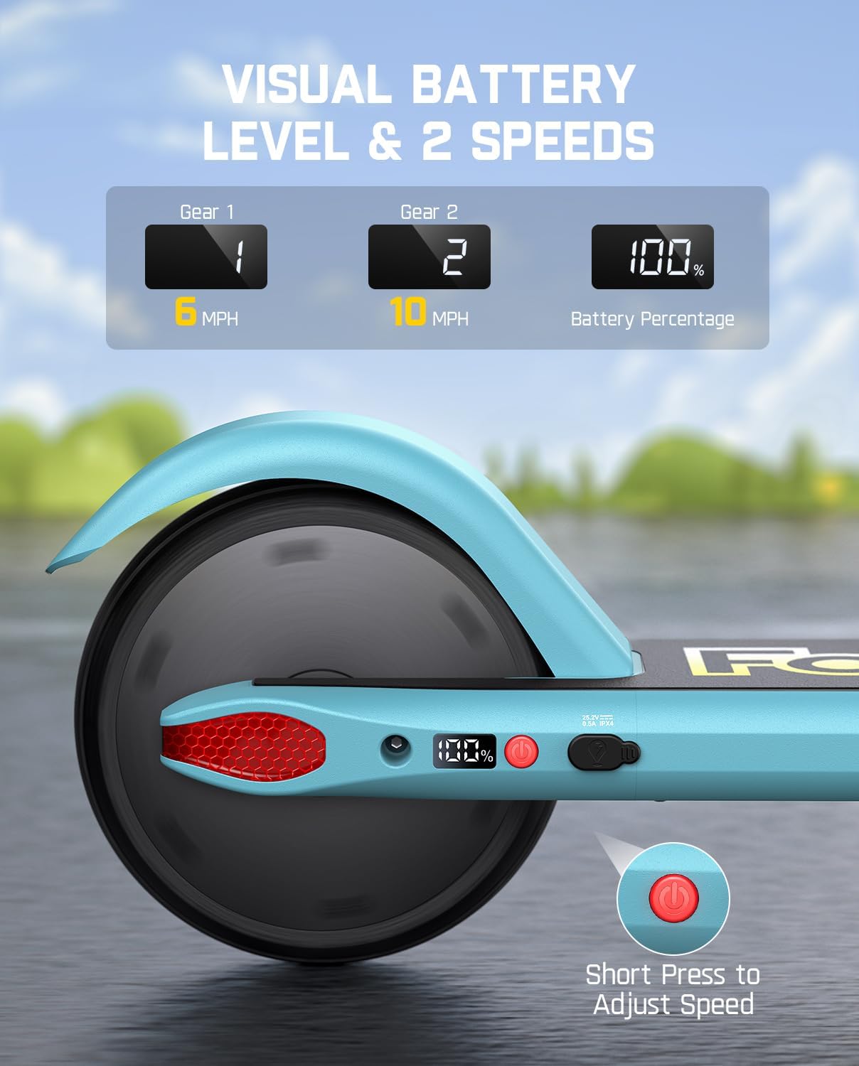 A reliable digital battery indicator shows the remaining battery percentage. With just a short press of the power button, kids can choose between speeds of 6 mph and 10 mph. This feature not only enhances confidence but allows tailored riding experiences for different age groups.