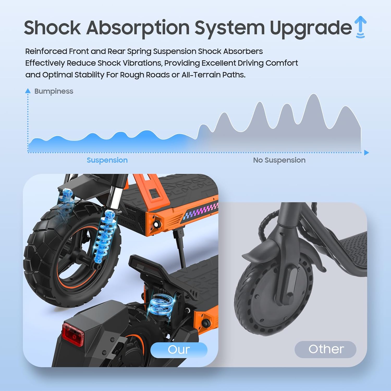 Riding on bumpy roads can lead to a jarring experience. Scooters equipped with a triple shock absorption system, including dual front shock absorbers and spring-loaded rear shock absorbers, can buffer up to 80% of road bumps, significantly improving comfort during rides.