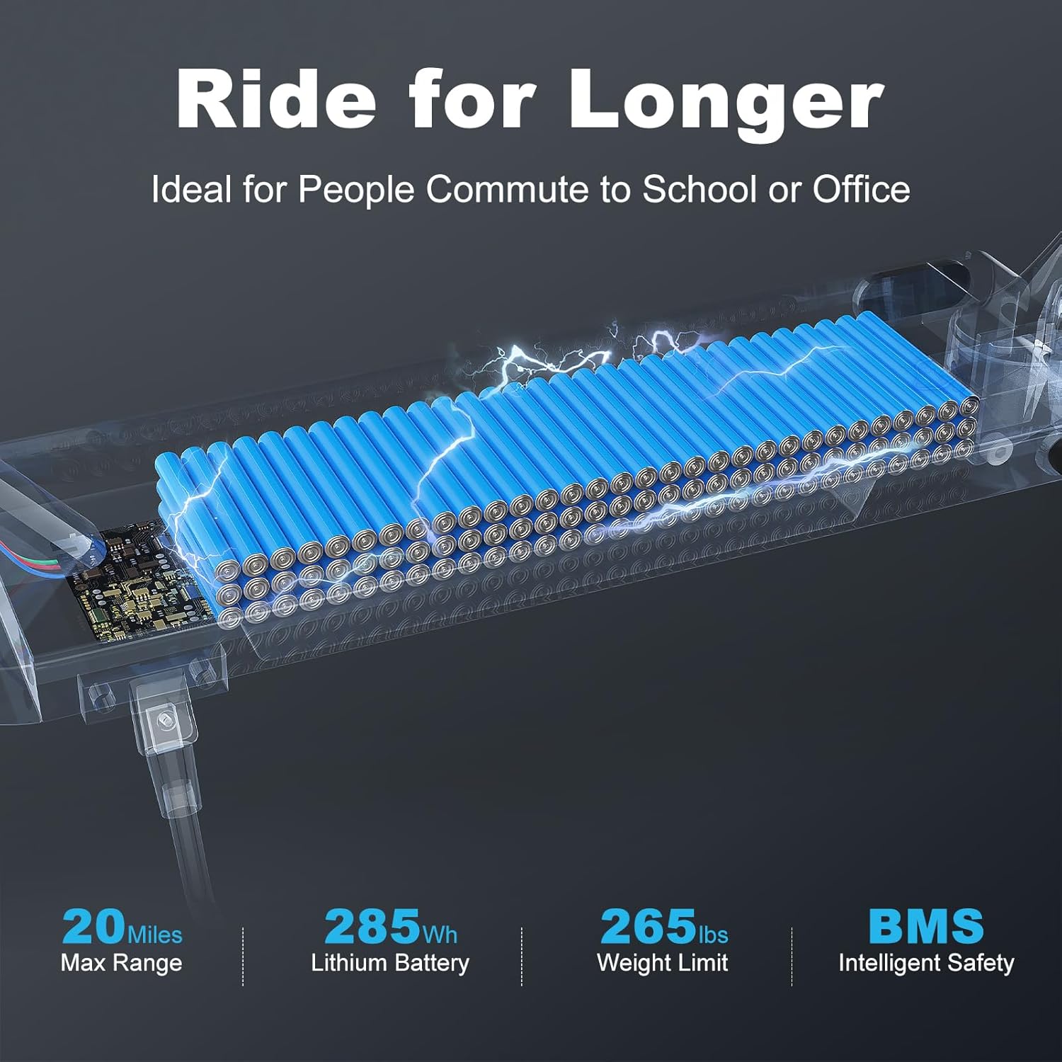 Equipped with a 285Wh large-capacity battery, this scooter supports a maximum travel range of 20 miles. Its superior battery management system guarantees longer life, providing peace of mind during your rides.