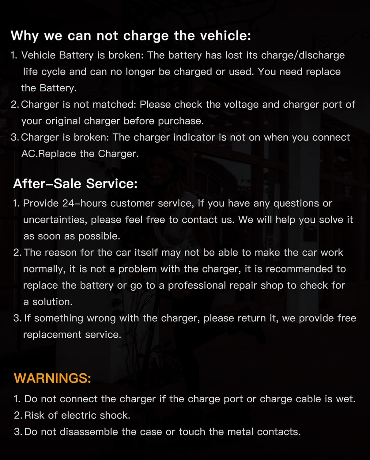 - Contact customer service for troubleshooting steps, as the charger comes with a warranty for defects.
