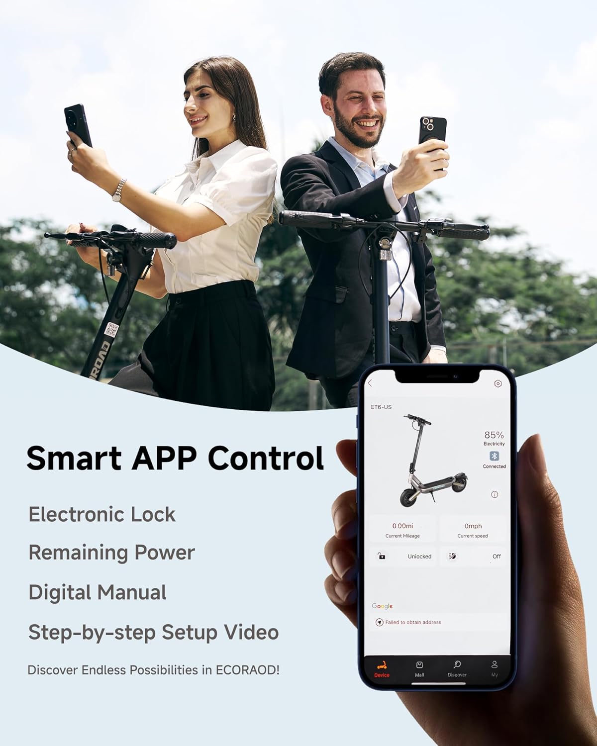 - ECOROAD App Integration: Lock your scooter electronically and track battery life in real-time for peace of mind.