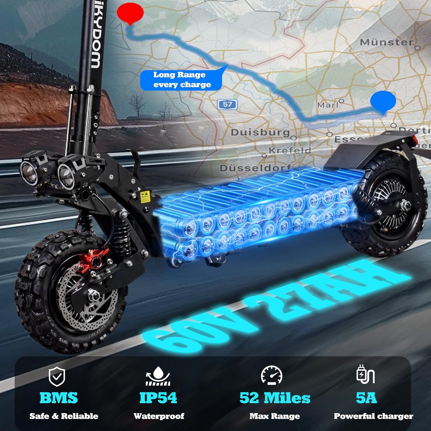 • Extended Range: The 60V27AH battery offers up to 52 miles on one charge.