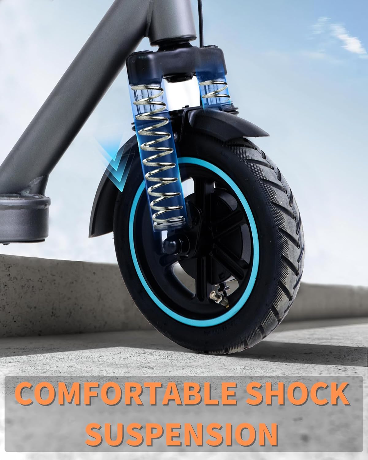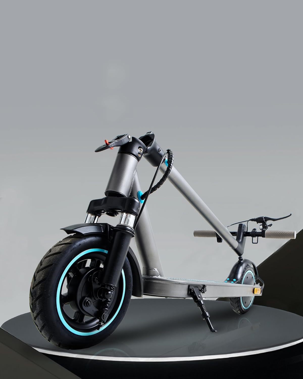 The scooter boasts a dual front suspension system, offering enhanced stability and comfort. This unique design ensures a smooth ride, even when navigating bumpy or steep terrains.