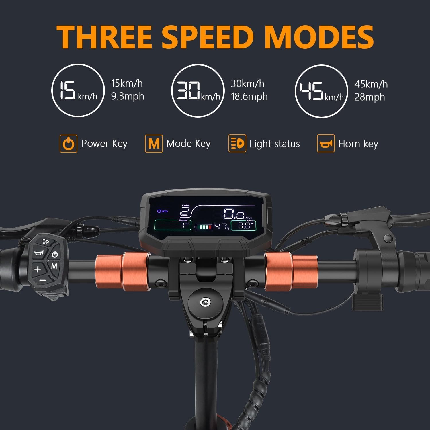 Riders can easily switch between three speed modes using the designated control on the handlebar.