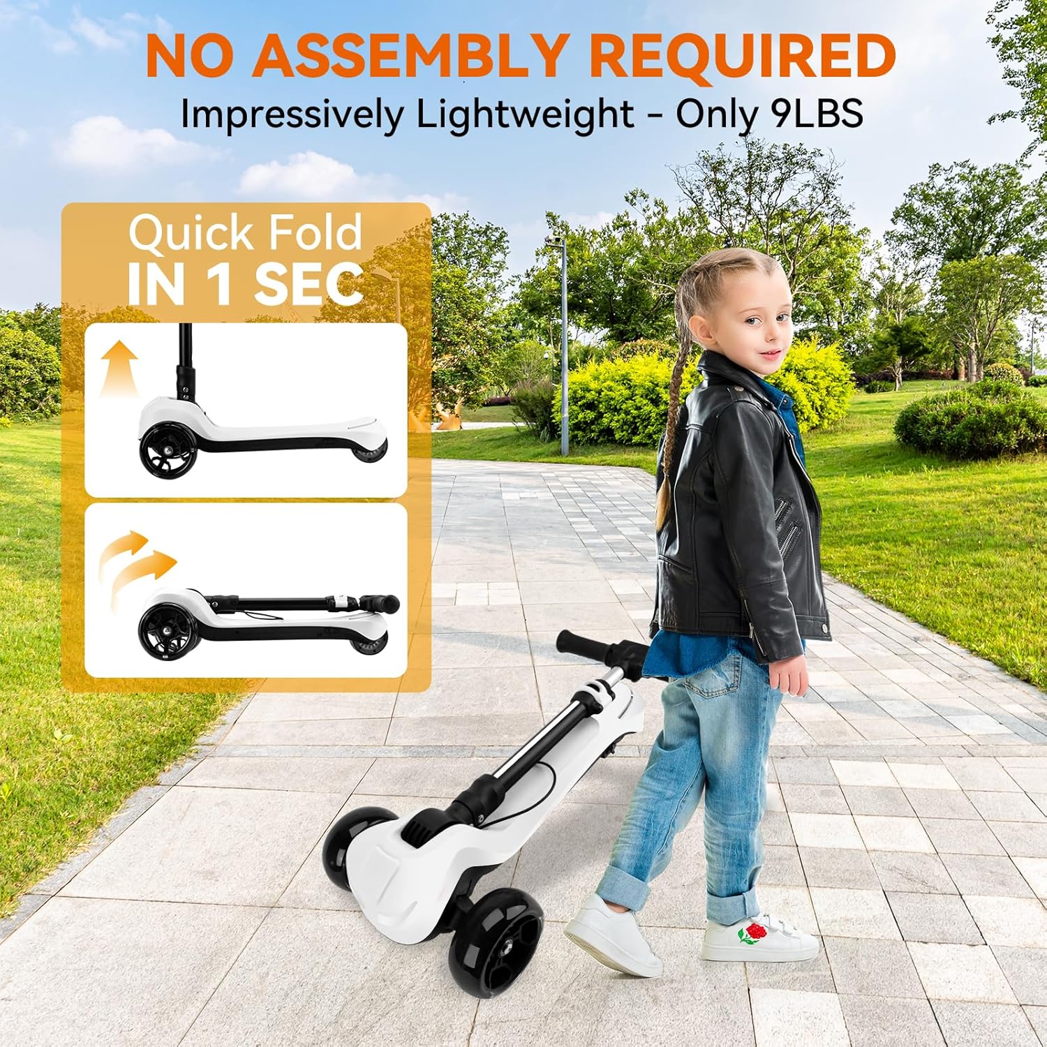 Say goodbye to complex assembly processes! With this electric scooter, you only need to unbox, charge, and unfold to start riding. Weighing merely 9 pounds, kids can easily handle it. The rust-resistant aluminum alloy handlebar offers three adjustable heights (25 inches, 28 inches, and 31 inches), making it adaptable for children aged three and above.