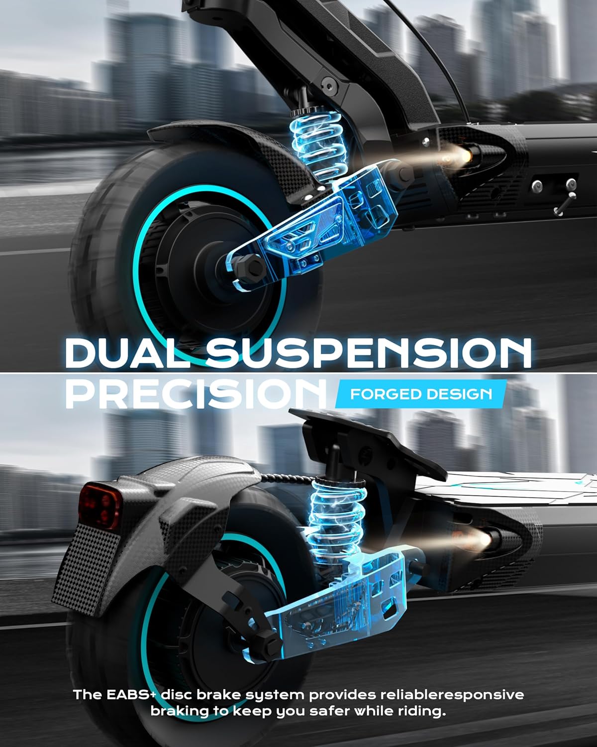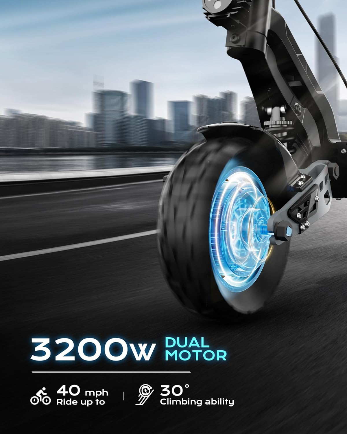 The RS3 electric scooter features dual 1600W motors, allowing it to reach speeds of up to 40MPH. This significant power output means that users can enjoy quick accelerations, zipping from 0 to 20MPH in just 2.5 seconds. For speed enthusiasts and urban explorers, this scooter offers a thrill like no other.