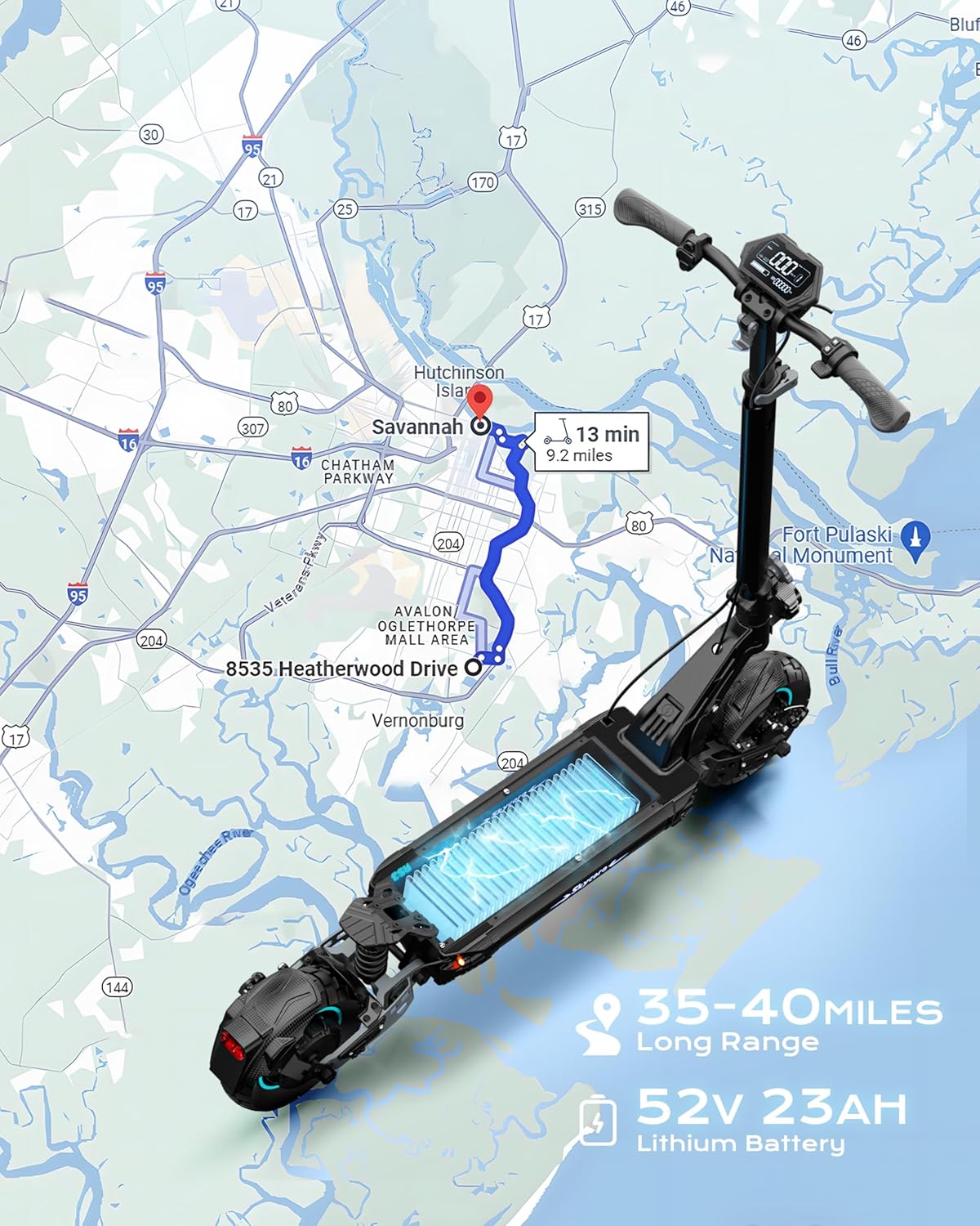 One of the standout features of the RS3 is its 52V 23Ah battery, which enables users to travel up to 35-40 miles on a single charge under optimal conditions. This extensive range makes it perfect for long rides and daily commutes without the hassle of constant recharging.