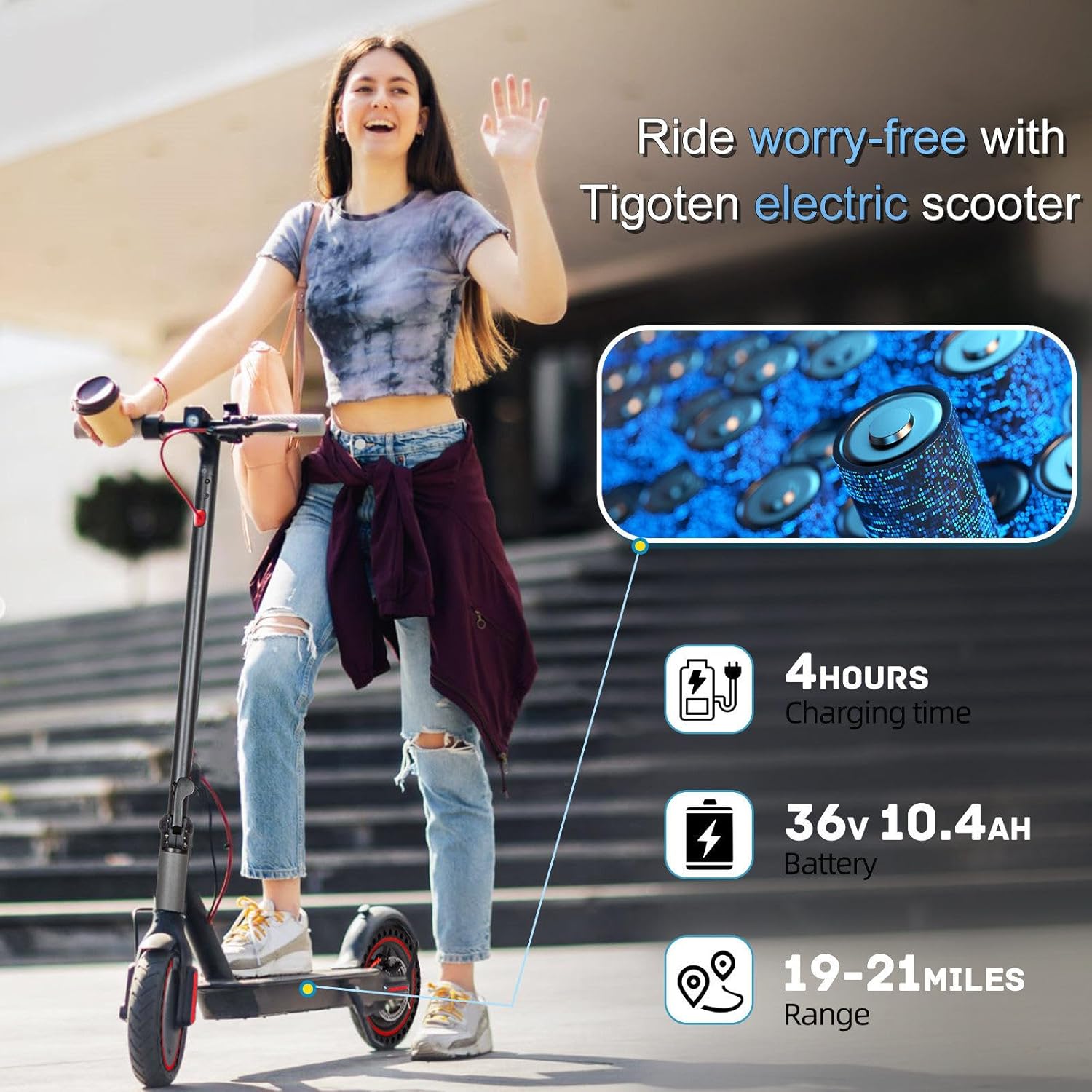 • 36V 10.4Ah Battery: This allows for a distance of up to 21 miles on a single charge, ideal for daily commuting.