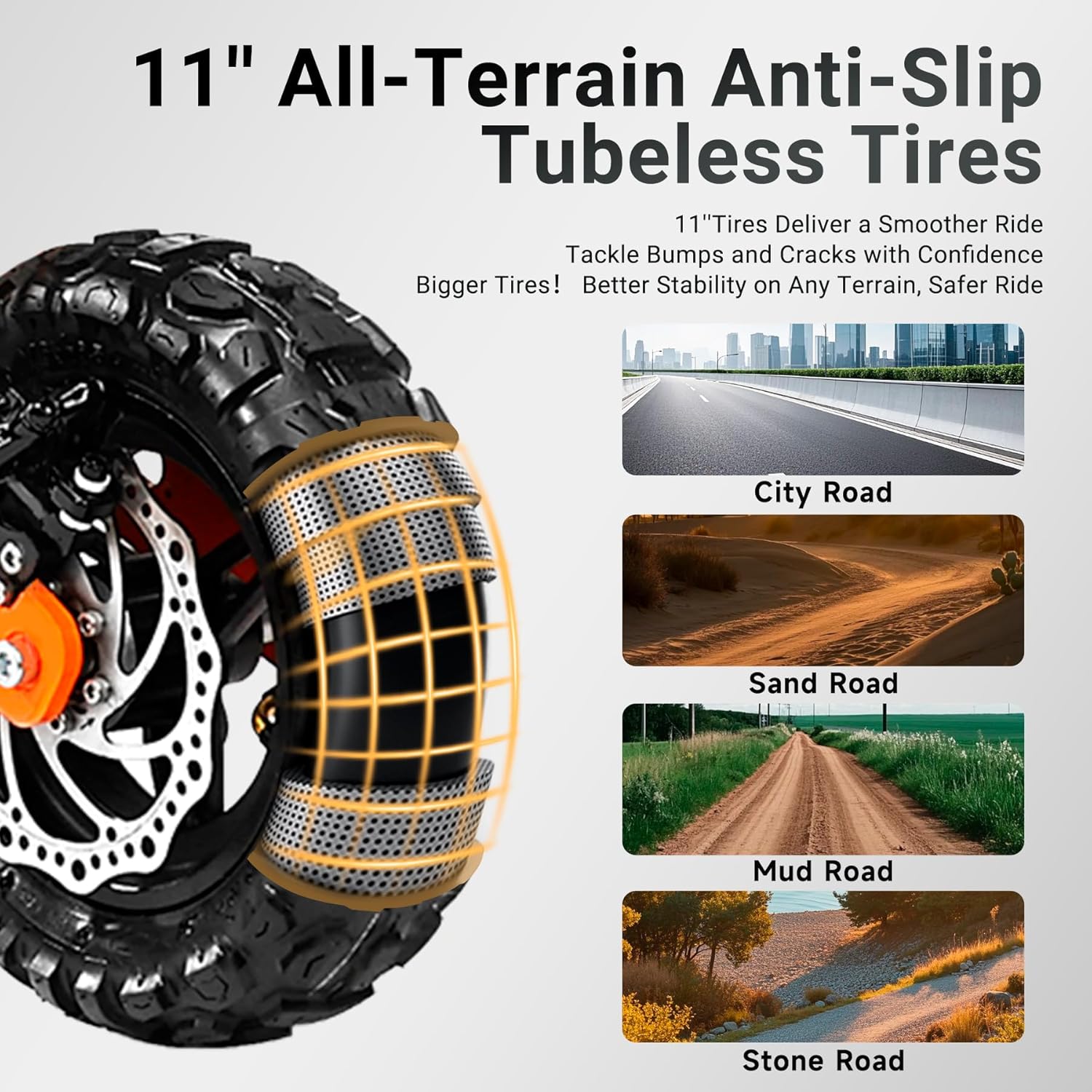 The scooter boasts a dual suspension system with four springs for improved shock absorption. Coupled with 11″ heavy-duty vacuum off-road tires, it offers excellent stability and durability. Whether youโ€™re navigating rough terrain or city streets, youโ€™ll enjoy a smoother ride.