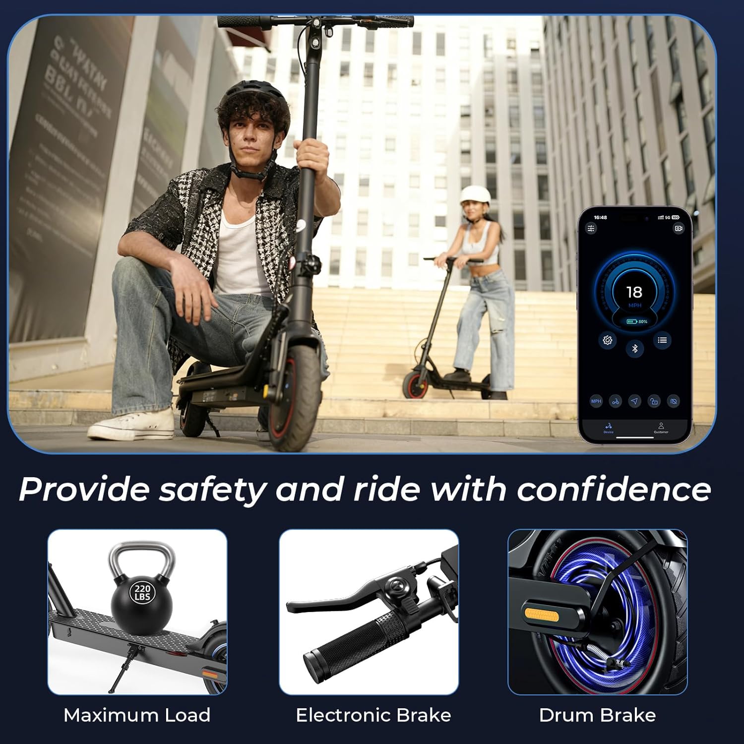 • The Bluetooth-enabled app allows you to monitor speed, mileage, and battery life, plus you can lock the scooter or adjust riding modes, making it a smart choice for families.