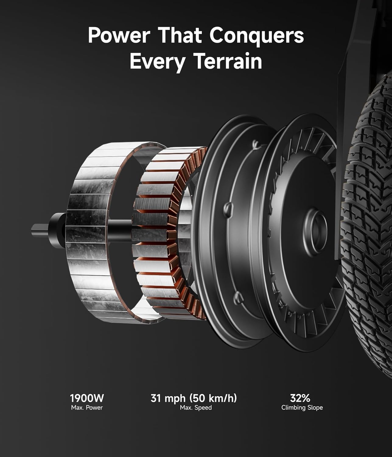 The NT5 Max boasts a top speed of 31 mph (50 km/h) powered by a 1900W peak motor, enabling it to handle steep inclines of up to 32%. Whether you’re in a hurry or just cruising, this electric scooter provides the adrenaline rush you crave.