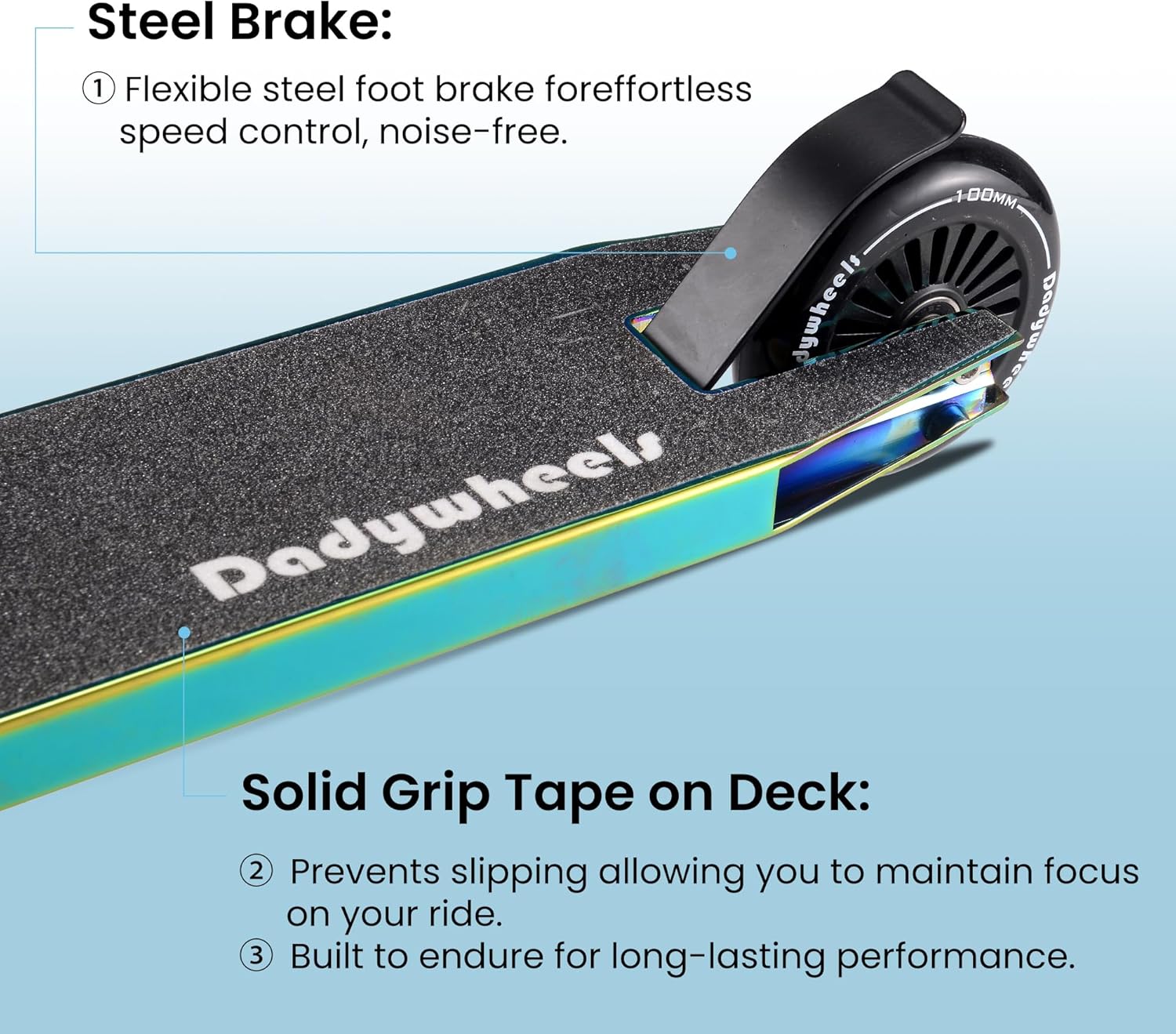 Equipped with 100mm PU wheels and ABEC-9 bearings, the Dadywheels stunt scooter offers impressive performance when it comes to tricks. The wheels are designed to absorb shocks efficiently, making it an ideal pick for young riders practicing jumps and turns.