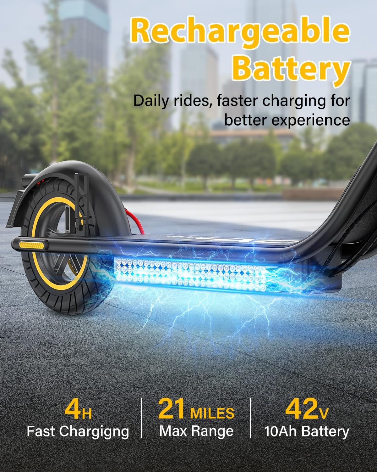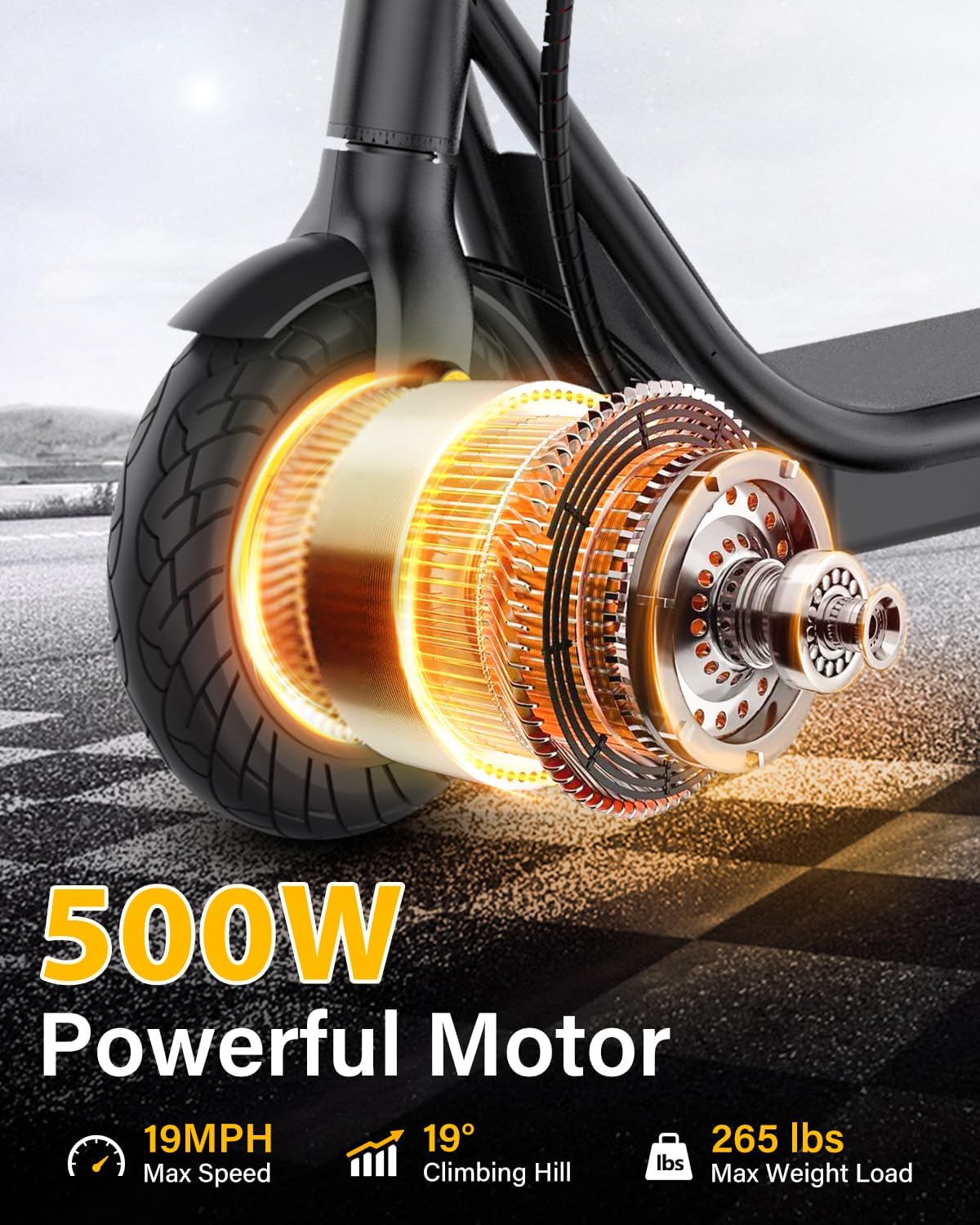 With its 500W brushless motor, this scooter can reach speeds up to 19 mph and offers a maximum range of 21 miles under optimal conditions. It supports riders up to 265 lbs, making it suitable for a diverse audience.