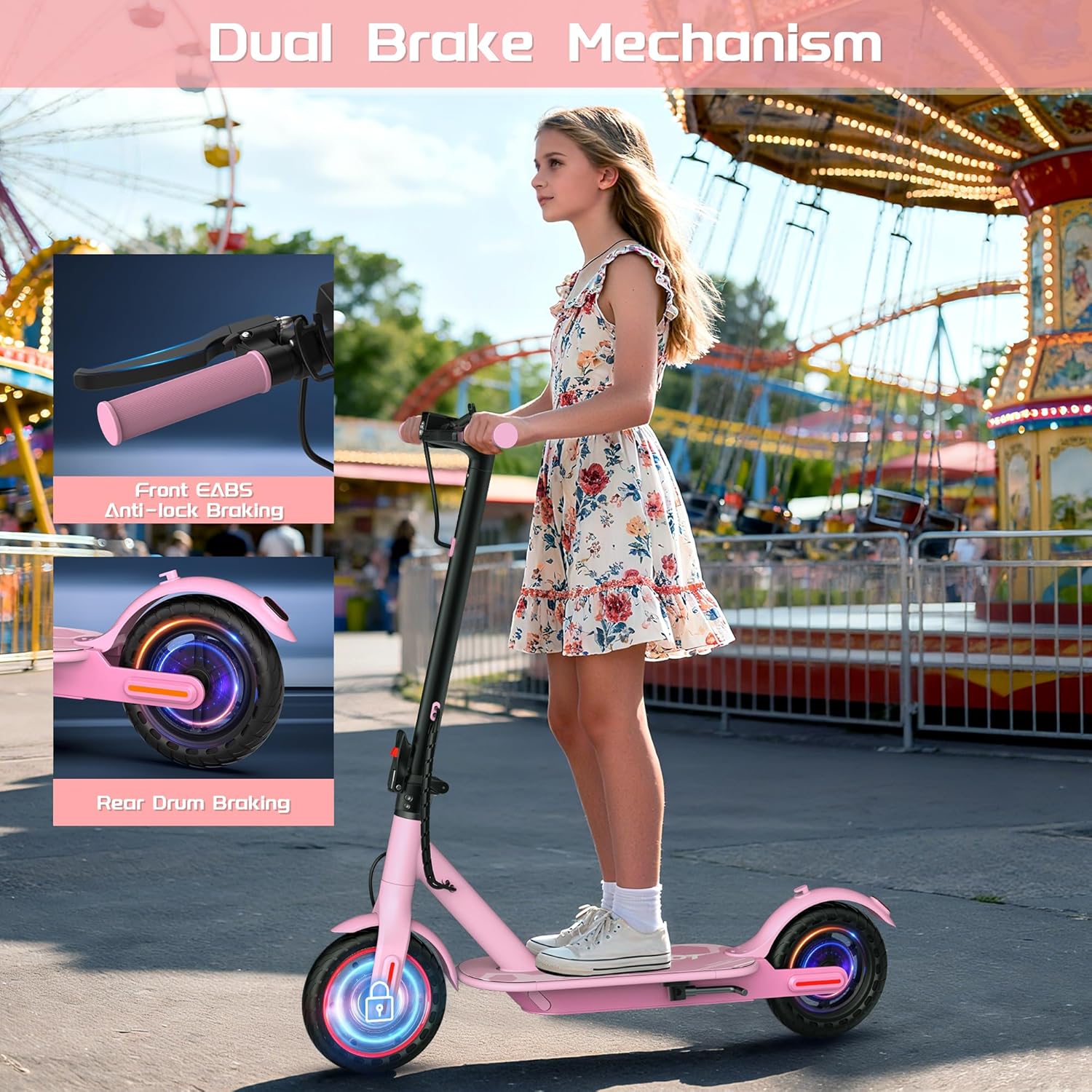 When it comes to kids and safety, the dual braking system of the MAXSHOT PR Pink is paramount. The scooter features an EABS electronic front brake and a rear drum brake, providing responsive stopping power that ensures a safer ride, especially in busy or unexpected situations.