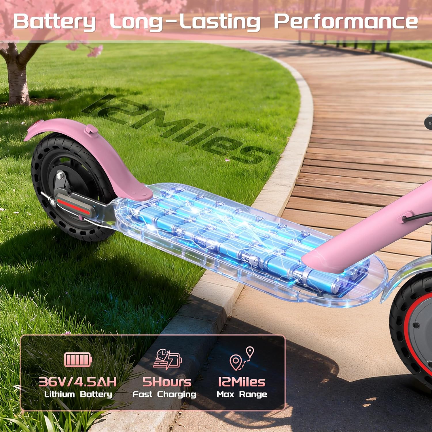 The 36V 162Wh lithium battery can provide a maximum range of 12 miles under optimal conditions, allowing for extended trips.
