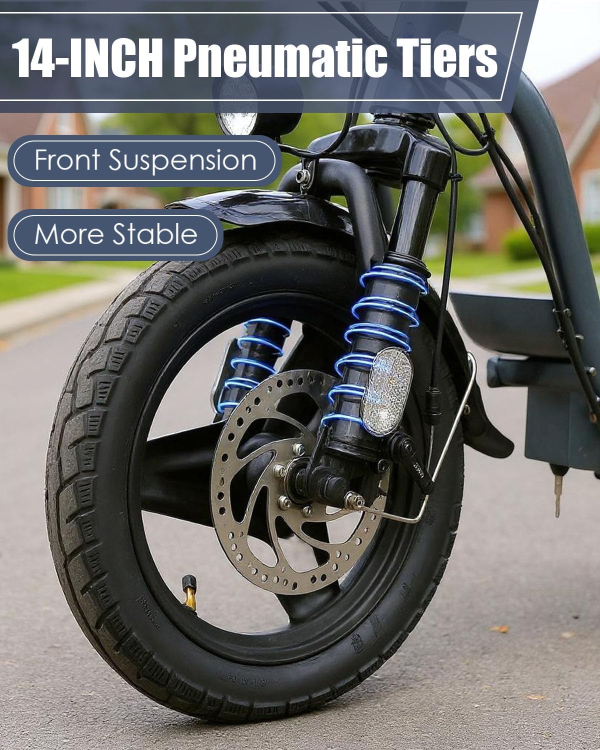The 14″ fat tires provide excellent grip, high elasticity, and wear resistance. This adds an extra layer of stability to your ride, allowing you to navigate different terrains confidently. Whether you’re commuting on smooth urban streets or tackling rugged pathways, these tires ensure a secure ride.