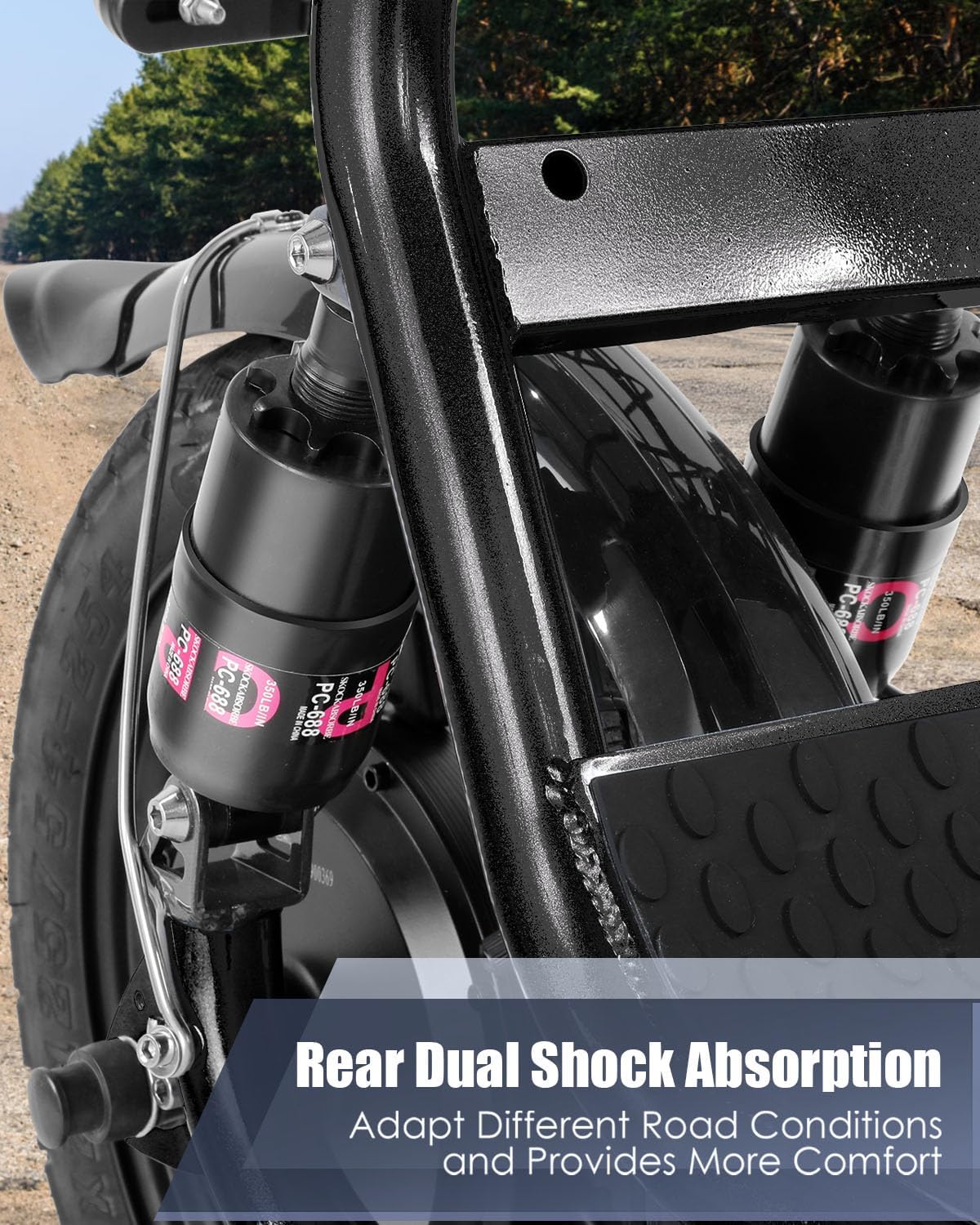 The Caroma Electric Scooter includes multiple shock absorption systems, such as: