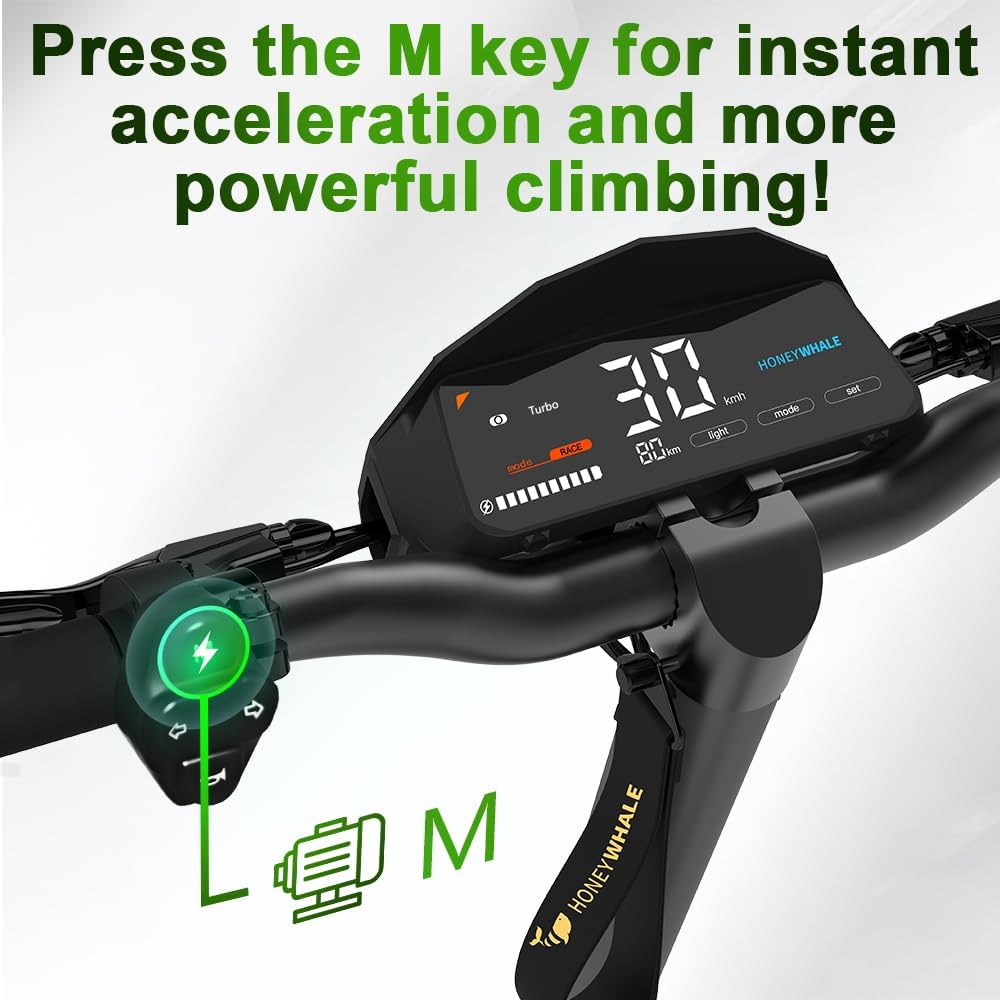 With a top speed of 31 mph, the HONEYWHALE H2D allows you to arrive at your destination quickly. Whether you’re commuting to work or enjoying a weekend ride, this electric scooter maintains its speed and efficiency, making it ideal for both daily and long-distance travel.